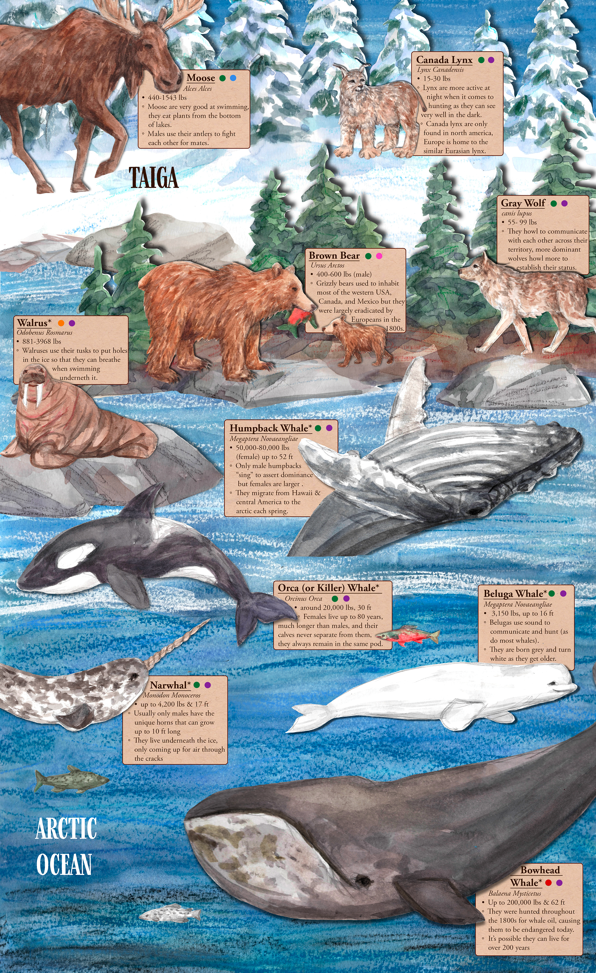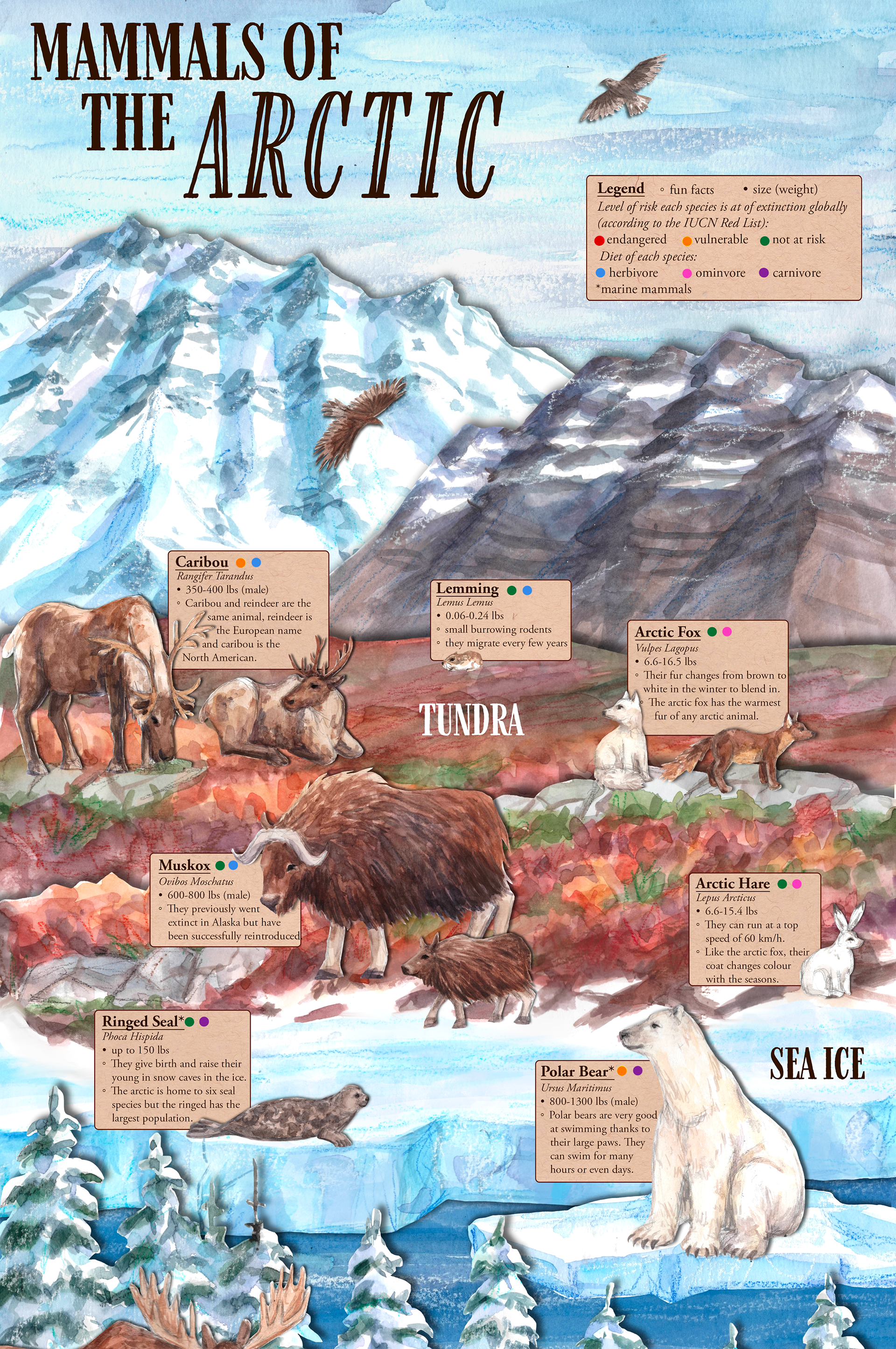 Children's infographic poster showcasing some of the mammals that live in the arctic region