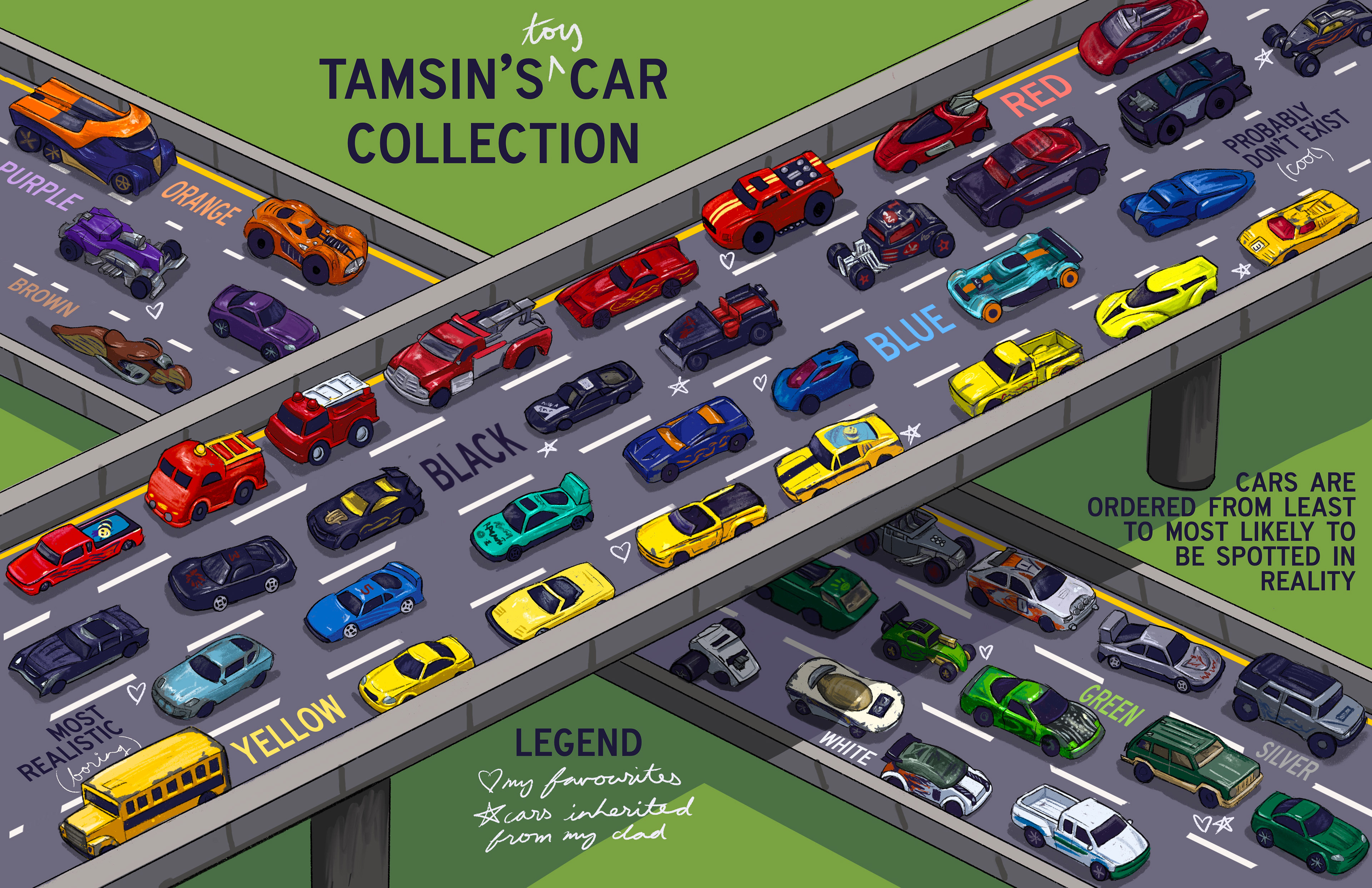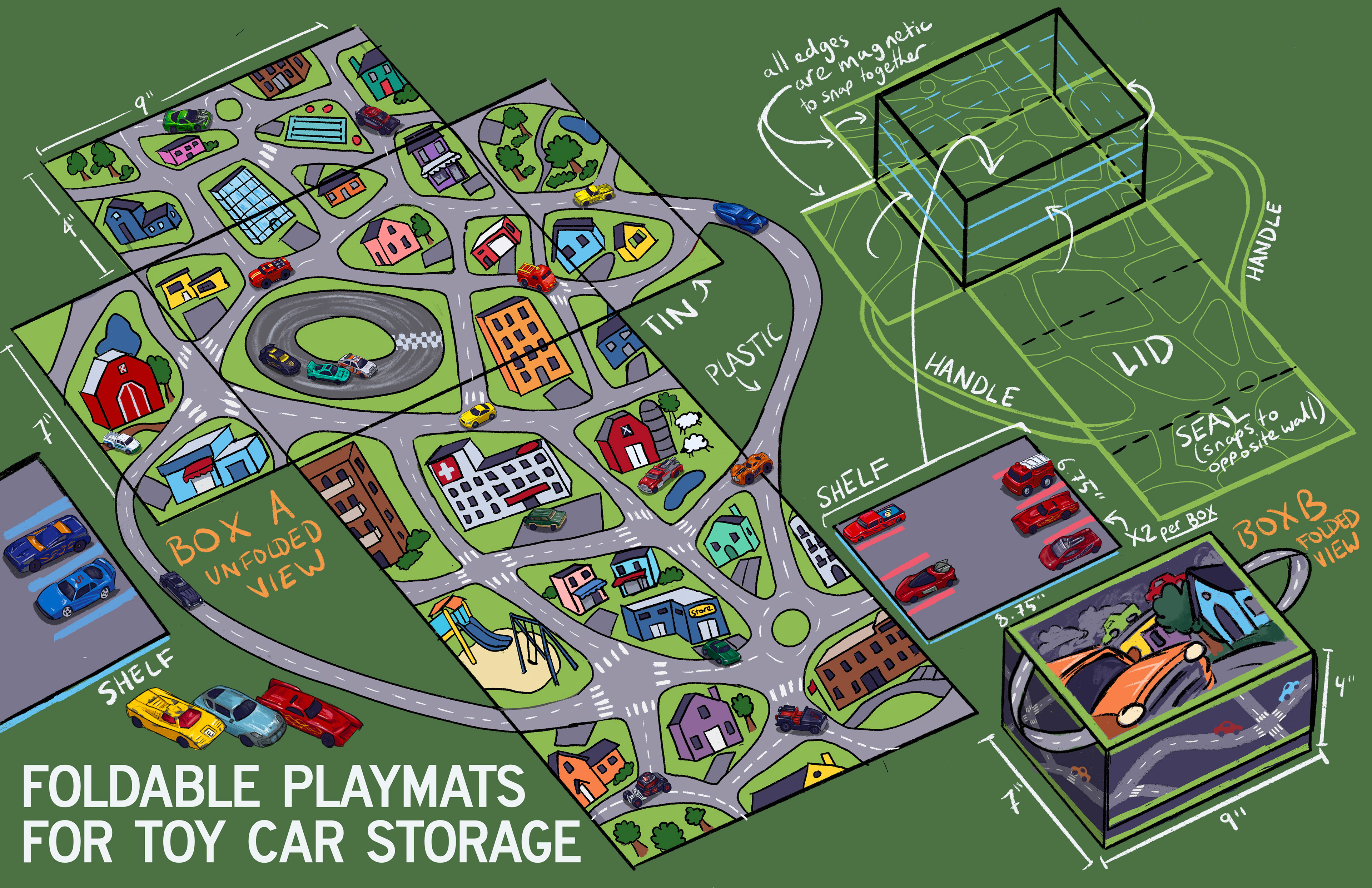 The left illustration focuses on sorting and organizing the collection into categories and hierarchies and the right illustration is a design for a storage device/play-mat for the collection